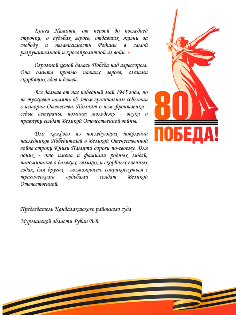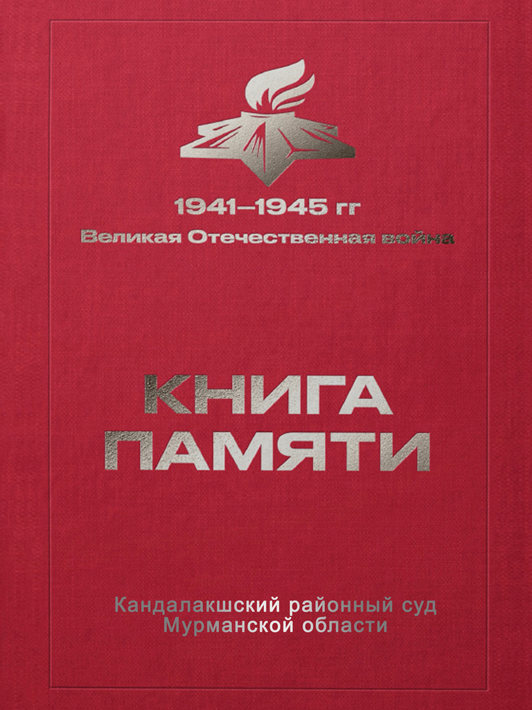 В преддверии празднования 80-ой годовщины дня Победы в Великой Отечественной войне 1941-1945 годов Кандалакшским районным судом Мурманской области издана Книга памяти, в которую вошли сведения о родственниках сотрудников Кандалакшского районного суда Мурманской области – участниках Великой Отечественной войны.